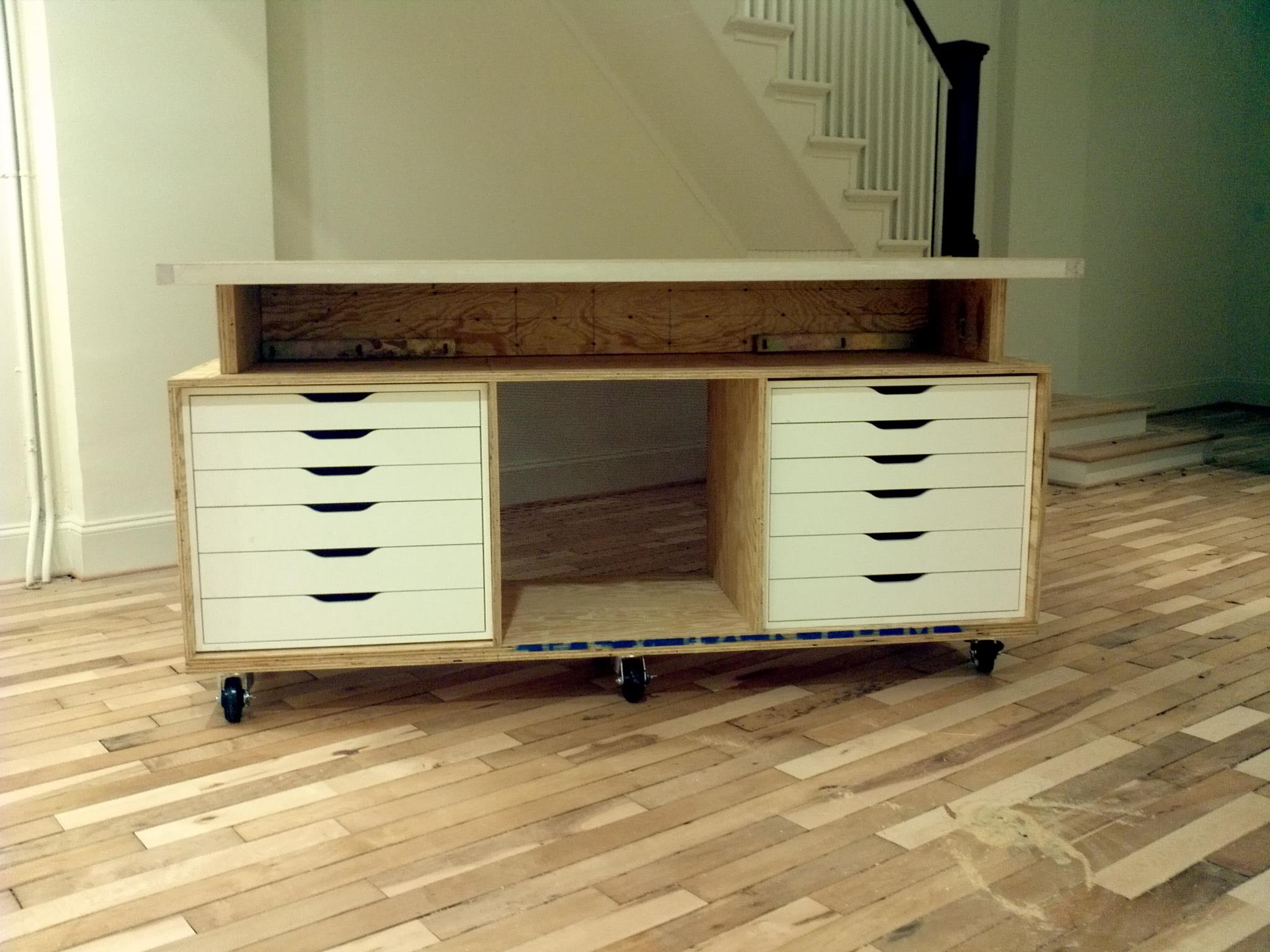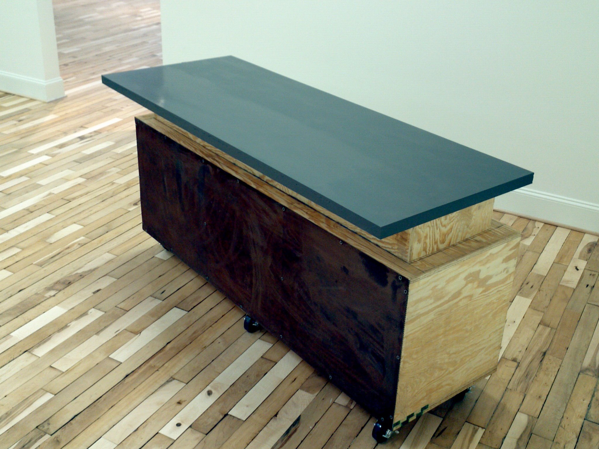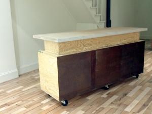 Faced with a short deadline before the opening of Candela Gallery, the owner had a problem. Establishing their new publishing company and photography gallery in a renovated building in Richmond Virginia’s newly designated “Arts District”, they needed a reception desk and cash wrap for greeting visitors and consummating retail sales. The renovation of the historic building had taken more money and time than expected which left little of both just days before the opening party and inaugural photography exhibition. Designed and fabricated on site, on time and on budget, the result is a fully functional mobile work station which is the only 3 dimensional piece in a sea of blonde wood floors and crisp white gallery walls.