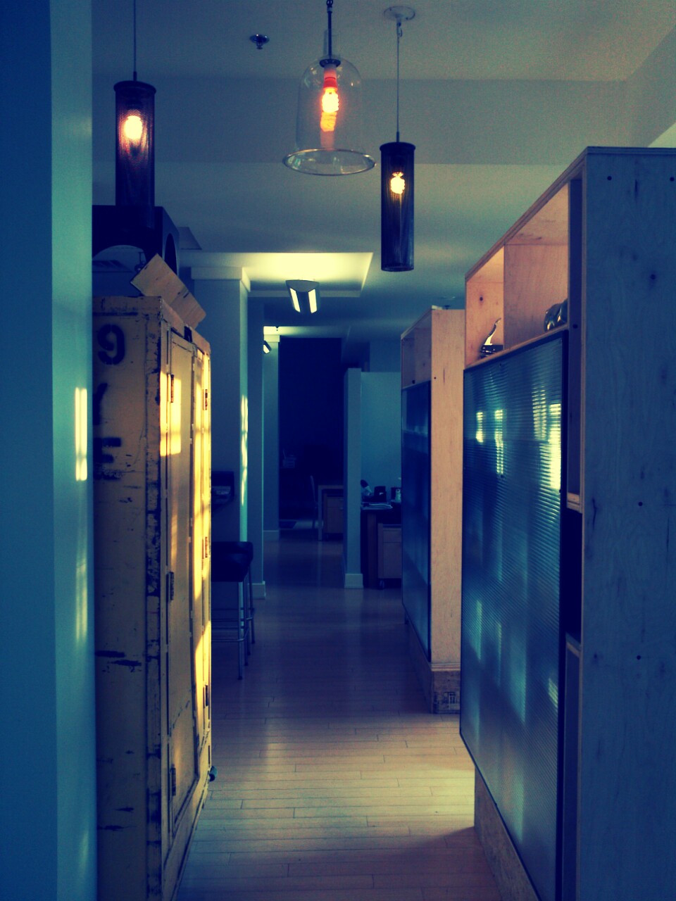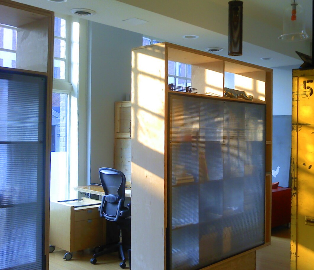 The challenge was in creating distinct areas of separation while retaining the openness and natural light of the original floor plan. Additionally, an atmosphere of collaboration between designers and managers required easy accessibility and “open doorways”. Further, the in-house design team also functions as a free agency and takes on outside clients. The exterior wall separations and public areas need to reflect the overall personality and creativity of the parent company, while the interior offices of the in house graphics team needed to imply a certain freedom and autonomy. Finally, it was the desire of the company principal to include original lighting and finishes but maintain a tight reign on costs. The company is growing quickly and anticipates needing more space before many of the expenditures of the renovations would be fully recouped. As a solution, all walls were built to float on the current floor and can be dismantled and moved to a new location.